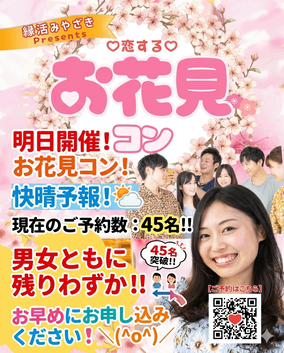 男性 20歳〜39歳 ¥8900円 女性 20歳〜39歳 ¥あと2名まで!2900円!【通常4500円】 宮崎市 03/29(日) 13:00〜 【全体で45名突破!男性ほぼ満席!】お花見街コン2026♪ 20代向け30代向け40代向けお花見街コン食事付き飲み放題 【最大50人!】お花見婚活!春に見...