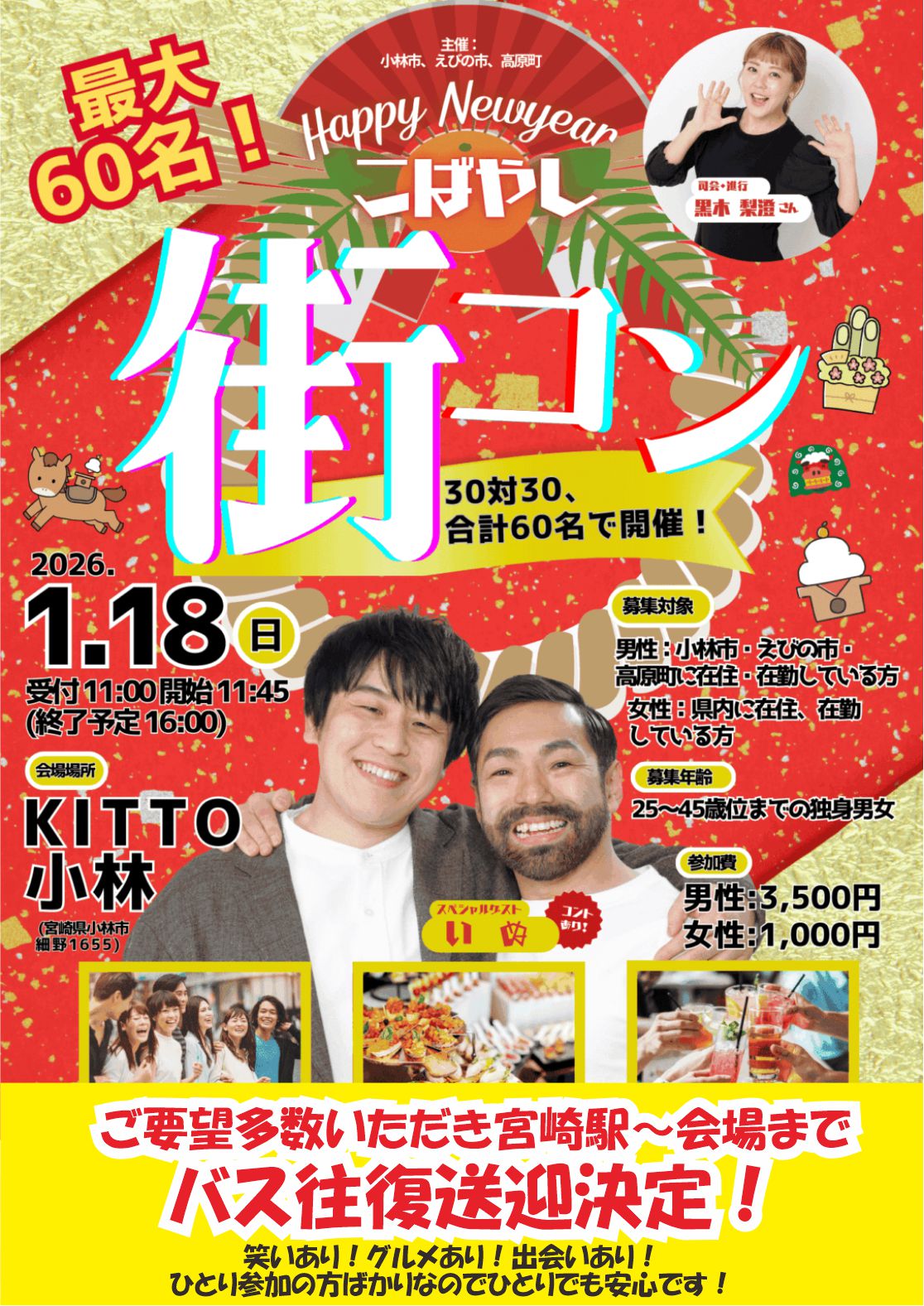 男性 25歳〜45歳 ¥3500 女性 25歳〜45歳 ¥1000 小林市 01/18(日) 11:45〜 《最大60名!グルメあり!笑いあり!大型街コン開催!》新春こばやし街コン! 20代向け30代向け40代向け街コン食事付き 【小林市・えびの市・高原町合同主...